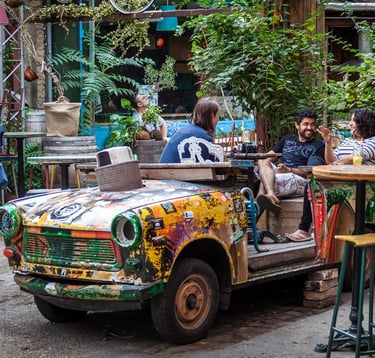 The original and still most iconic of these bars is Szimpla Kert, opened in 2002, which set the tone for what a romkocsma could be: part bar, part gallery, part community center. It was a place where you could sip fröccs (wine spritzer) in a bathtub repurposed as a sofa, watch an avant-garde film projected onto a cracked wall, or listen to a zenekar (band) playing live music in a graffiti-covered garden. Other bars like Instant, Fogasház, and Ellátó Kert followed suit, each offering its own interpretation of the genre—some leaning into elektronikus zene (electronic music), others hosting irodalmi estek (literary evenings), jógaórák (yoga classes), or even bringás boltok (bike shops). The underlying ethos of all these places is accessibility and spontaneity; no polished aesthetics or velvet ropes, just a shared love of atmosphere, music, and social connection.