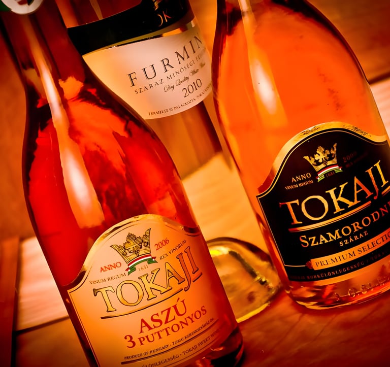 Tokaji aszú (Tokaj aszú wine) is crafted from hand-selected, shriveled aszúszemek (aszú grapes), painstakingly picked berry by berry, and blended into alapbor (base wine), often made from varieties like furmint, hárslevelű, or sárgamuskotály (muscat blanc). The result is a golden, often amber nectar, sweet yet structured, with notes of barack (apricot), méz (honey), narancshéj (orange peel), and dió (walnut). Its complexity deepens with age, and bottles are often stored in pincék (cellars) carved into volcanic rock, where the constant temperature and high humidity ensure perfect maturation. The most prized versions are labeled by puttonyszám (number of puttonyos), a traditional measurement of sweetness and intensity—ranging from 3 to 6 or even the ultra-rare eszencia, a syrup-like wine made entirely from the free-run juice of the botrytised grapes.